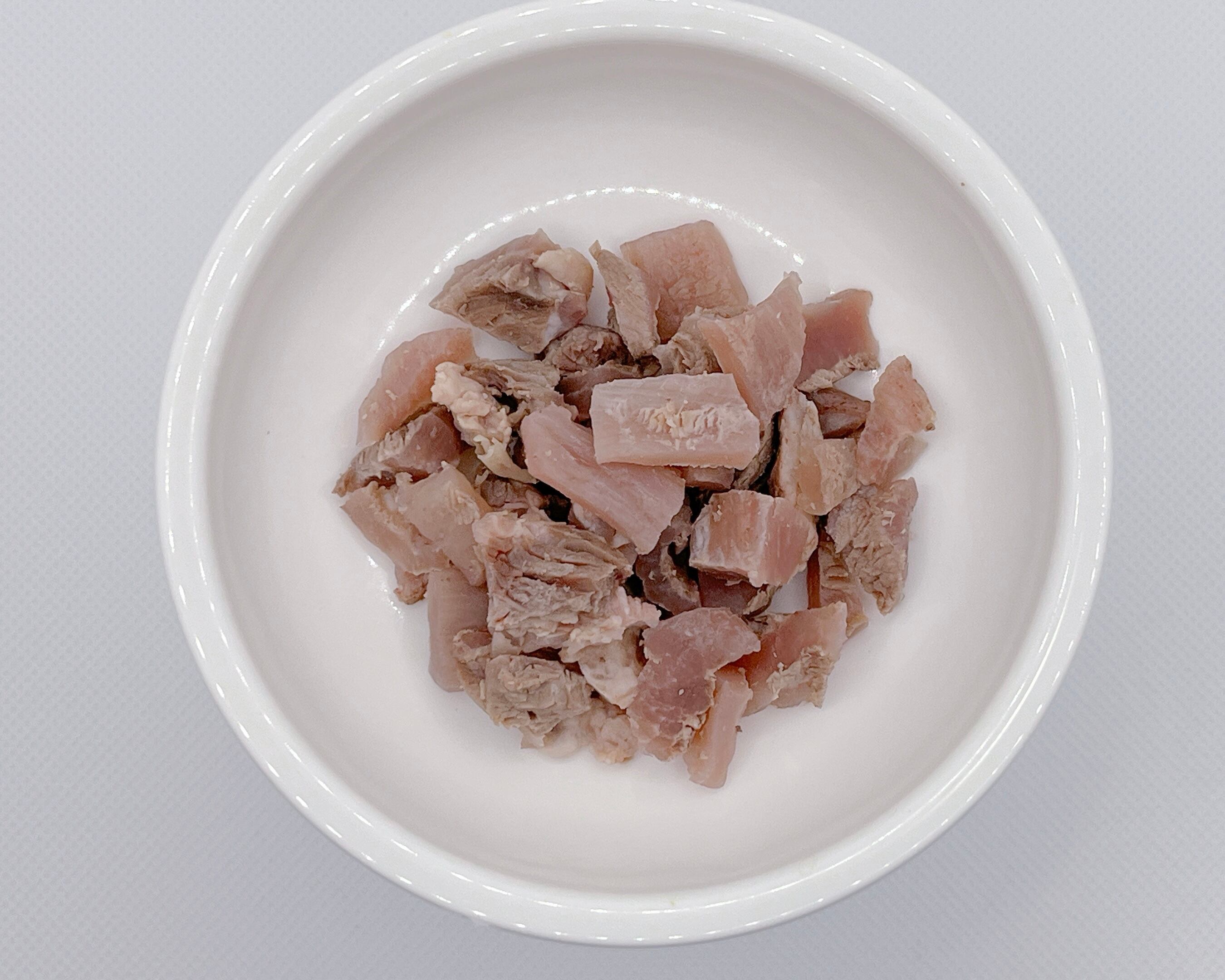 •脂分は丁寧に取り除き、脂っぽさを抑え、小さくカットしたことで消化に優しく仕上げています。
